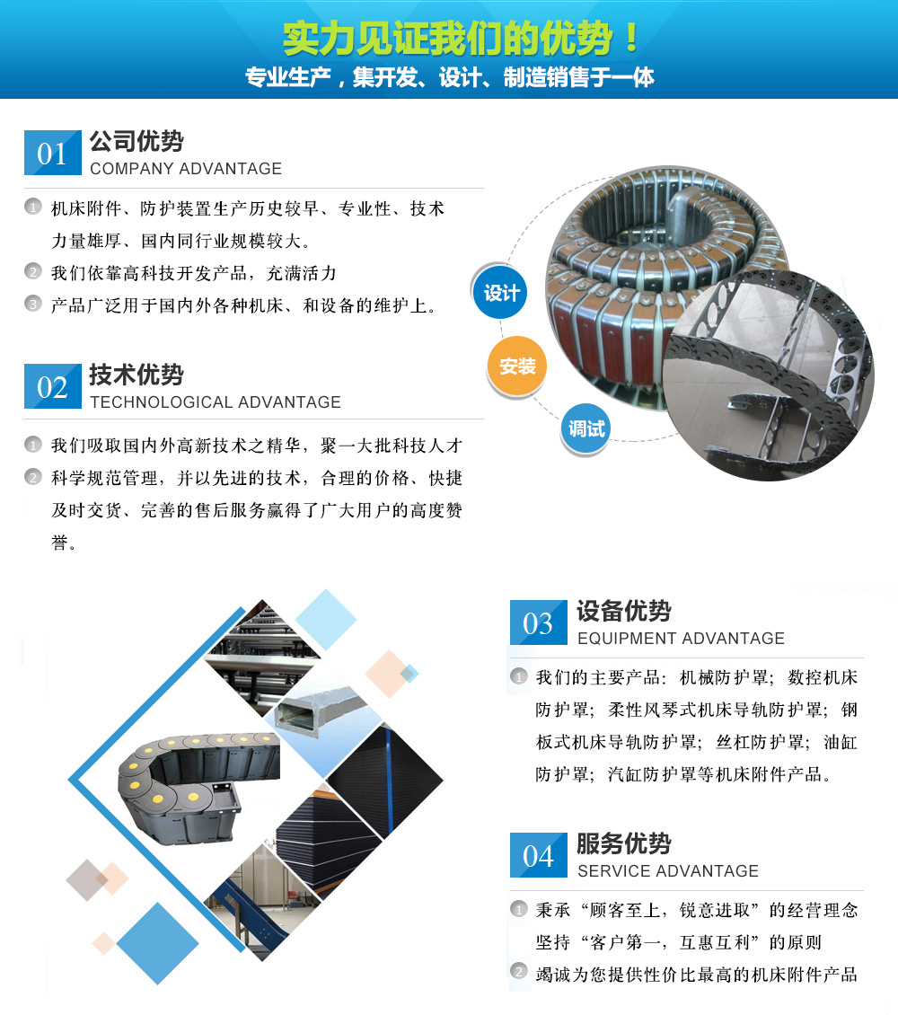 蘇州韻水機床附件有限公司 ,是專業生產,集開發、設計、制造銷售于一體,是機床附件、防護裝置生產歷史較早、專業性、技術力量雄厚、國內同行業規模較大。我們依靠高科技開發產品,充滿活力,產品廣泛用于國內外各種機床、和設備的維護上。我們的主要產品:機械防護罩;數控機床防護罩;柔性風琴式機床導軌防護罩;鋼板式機床導軌防護罩;絲杠防護罩;油缸防護罩;汽缸防護罩;耐高溫防護罩;盔甲式防護罩;焊接防護罩;螺旋鋼帶防護罩;風琴式防塵折布防護罩;醫療器械防護罩;精密儀器防護罩;升降機防護罩;鋁型防護簾;托架式卷簾防護罩;盒式卷簾防護罩;自動伸縮式鋼帶;機床排屑機;還有可調塑料冷卻管...